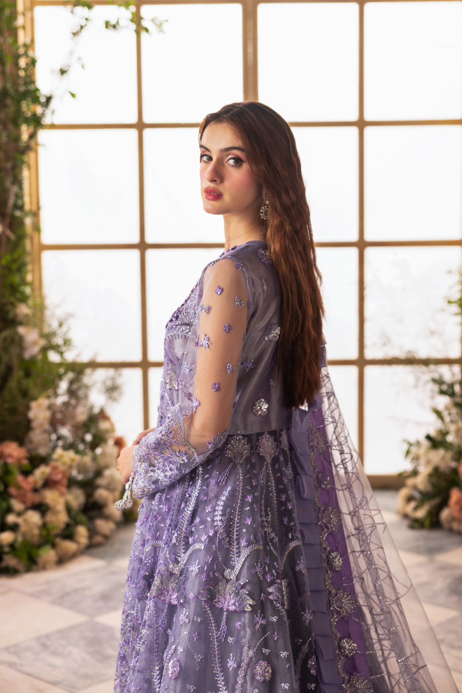 Embroidered net double flare front & back lehenga/maxi 2 yds