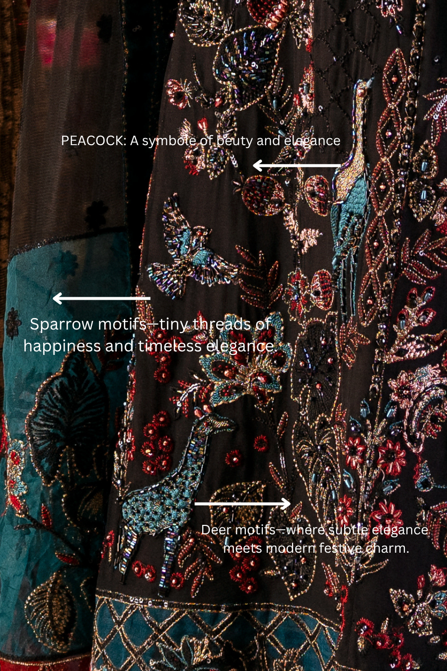 The dress features intricate motif embroidery—a graceful peacock symbolizing beauty, a majestic deer reflecting elegance, and a delicate sparrow embodying grace and liveliness. These hand-crafted details transform the outfit into more than attire; it becomes a story woven in thread, making it a trendsetter in Pakistani designer wear.