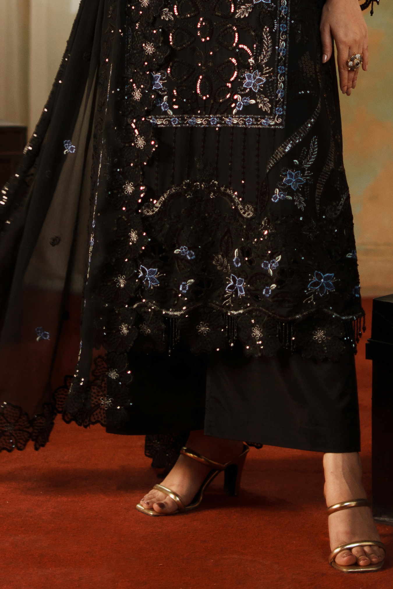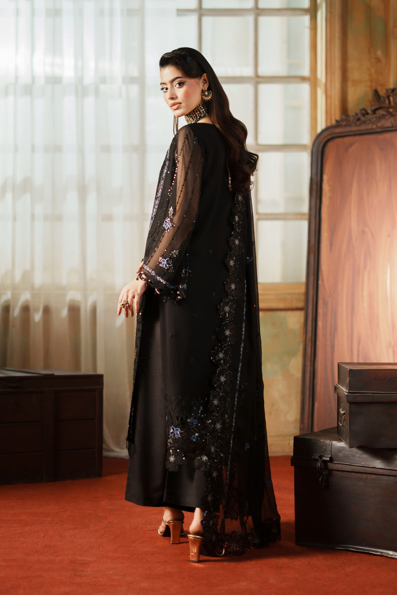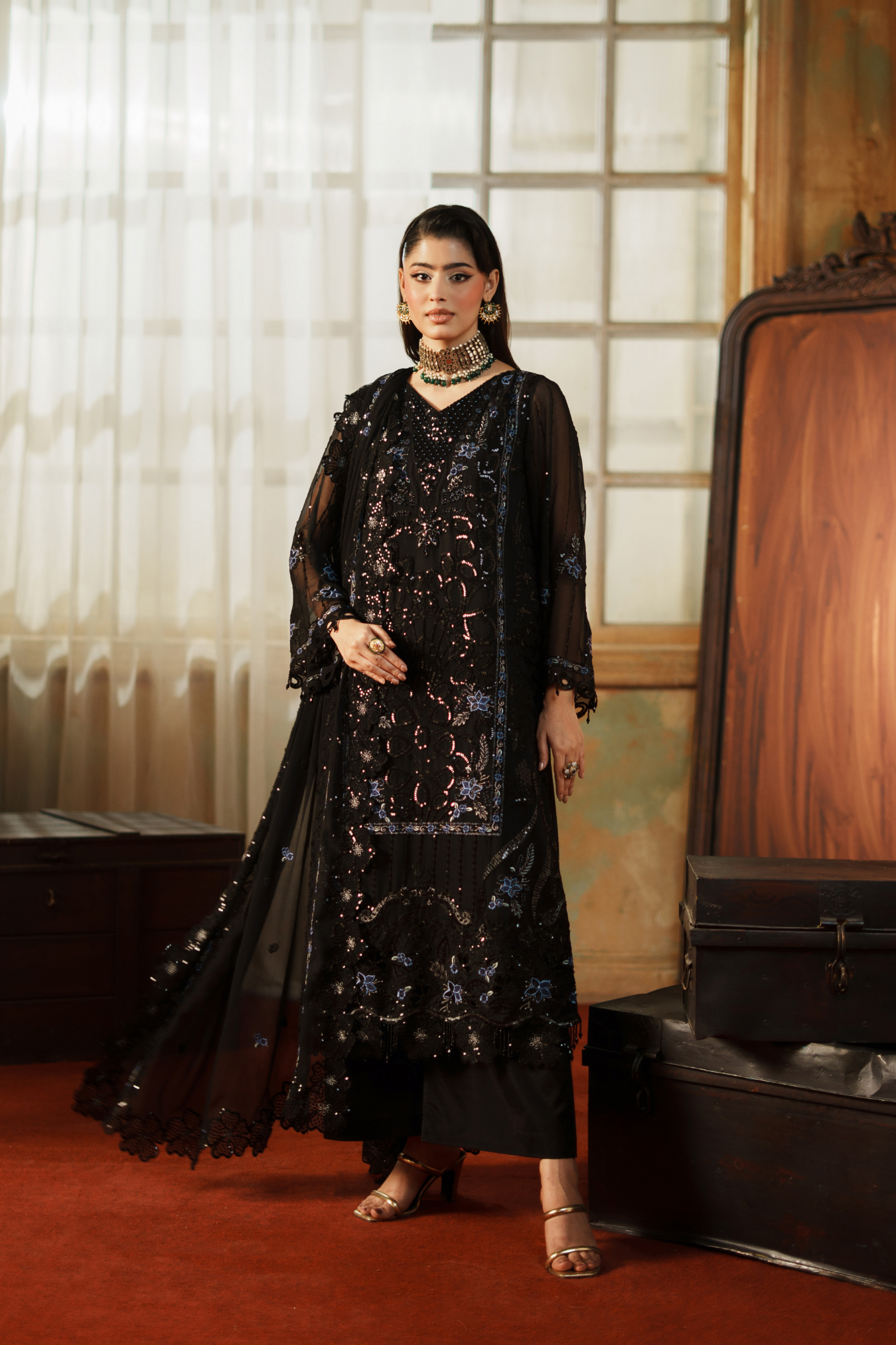This exquisite ensemble features premium embroidered weightless chiffon crafted with meticulous H.M detailing. The front panel spans 1 yard of delicate fabric, complemented by an equally refined back section. Sleeves are cut from 0.67 yards of the same ethereal chiffon, while a 64-inch embroidered ghera lace provides elegant hemming. Coordinating sleeve lace adds sophisticated finishing touches across 1 yard. The ready-made dupatta extends 2.5 yards in matching embroidered chiffon with four-sided borders for complete coordination. Complete your look with the included grip silk trouser, offering 2.5 yards of comfortable, structured fabric that balances the flowing upper silhouette perfectly.