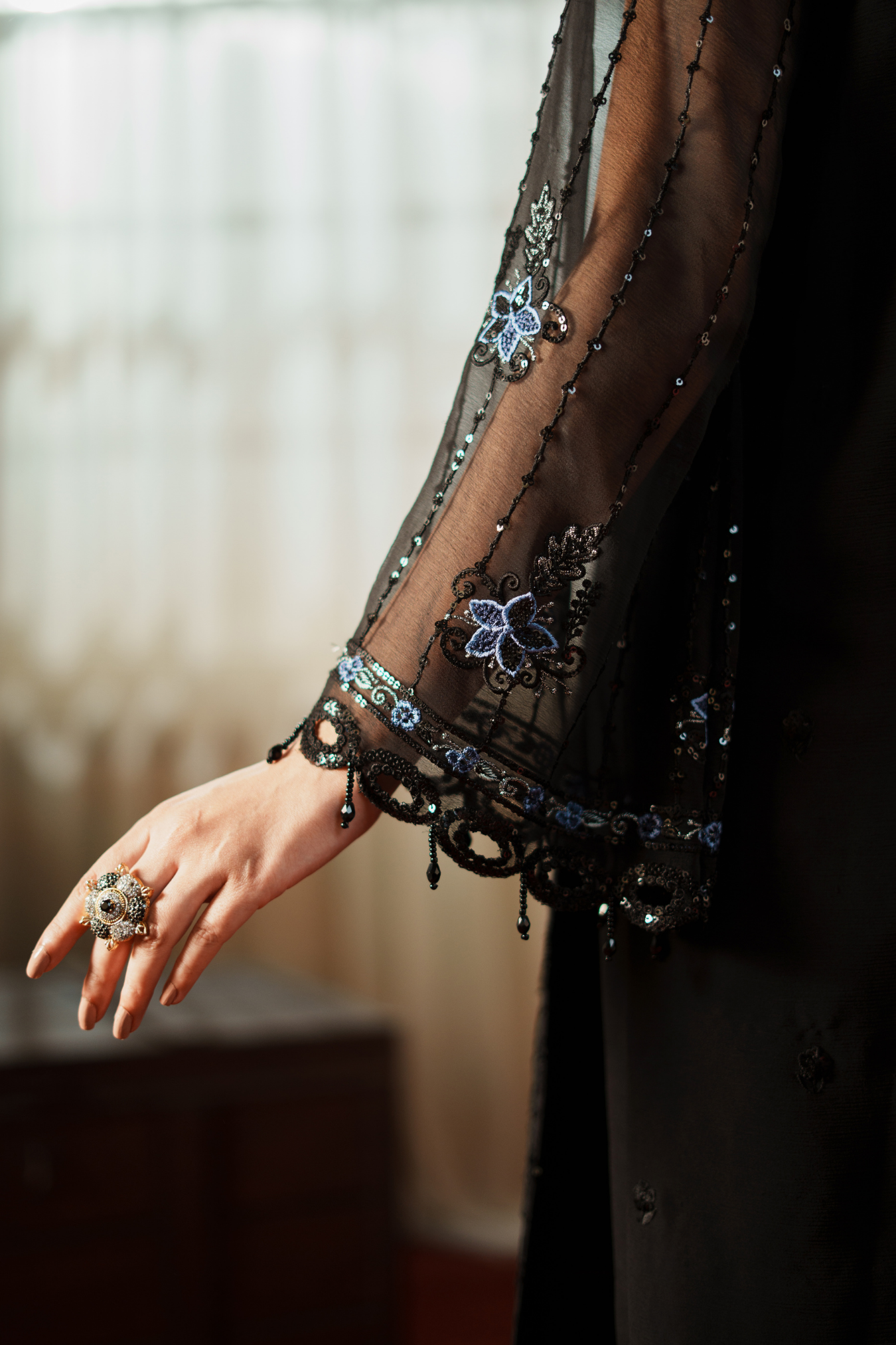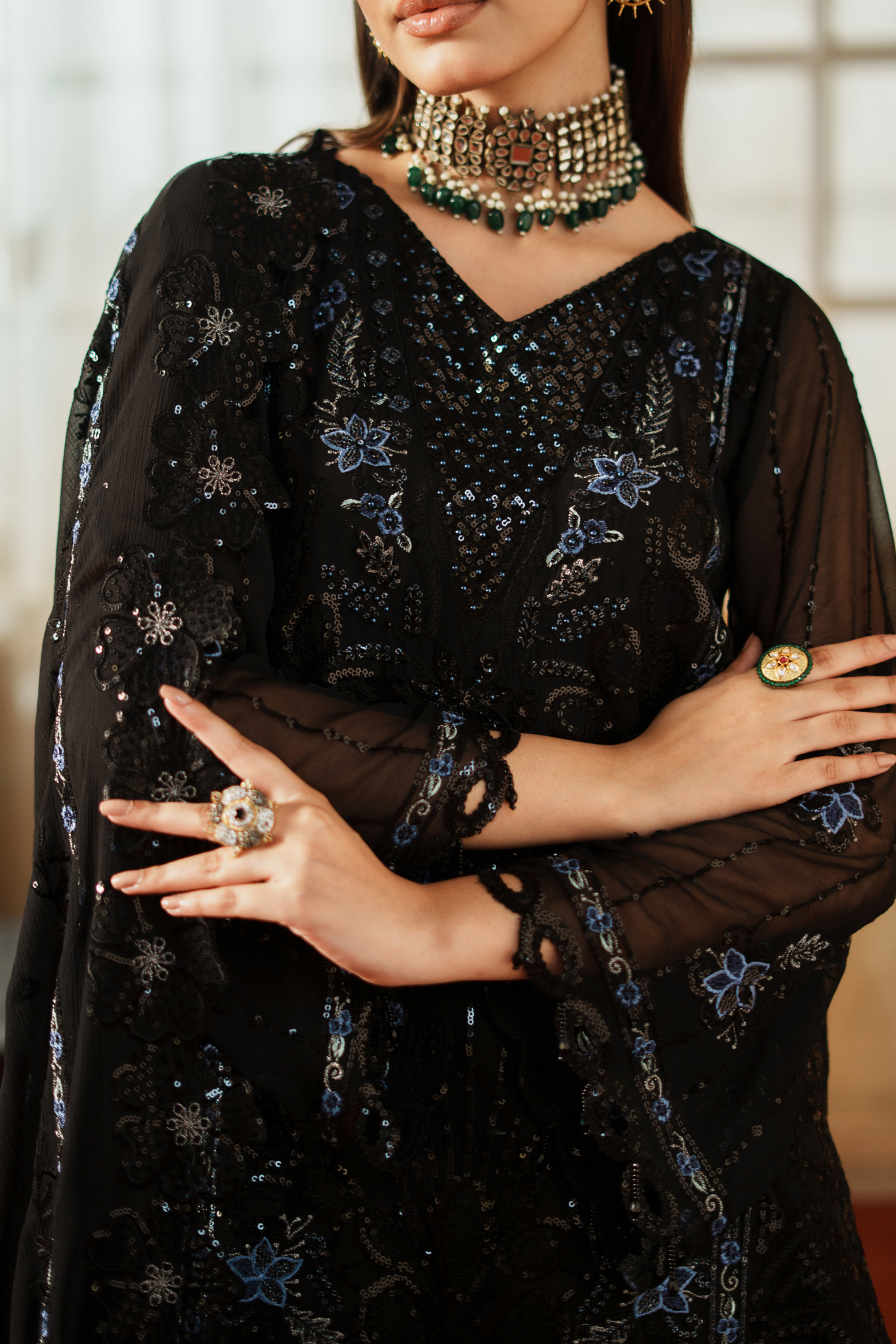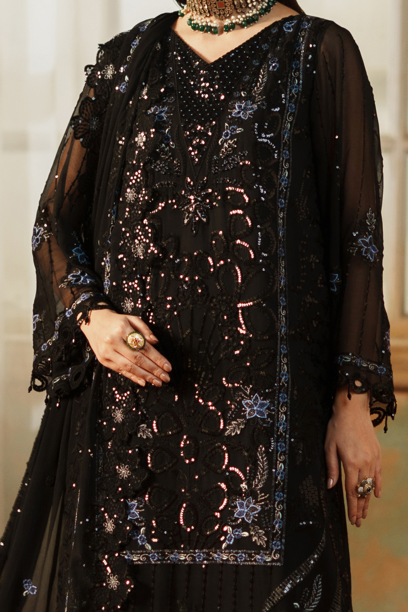 This exquisite ensemble features premium embroidered weightless chiffon crafted with meticulous H.M detailing. The front panel spans 1 yard of delicate fabric, complemented by an equally refined back section. Sleeves are cut from 0.67 yards of the same ethereal chiffon, while a 64-inch embroidered ghera lace provides elegant hemming. Coordinating sleeve lace adds sophisticated finishing touches across 1 yard. The ready-made dupatta extends 2.5 yards in matching embroidered chiffon with four-sided borders for complete coordination. Complete your look with the included grip silk trouser, offering 2.5 yards of comfortable, structured fabric that balances the flowing upper silhouette perfectly.