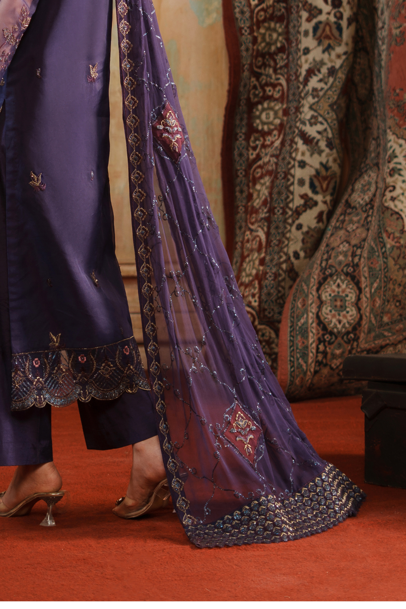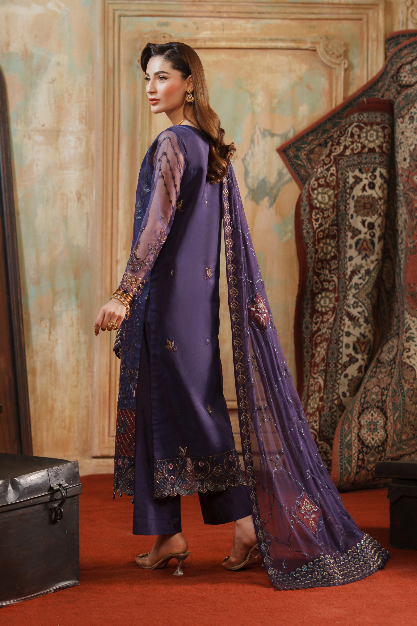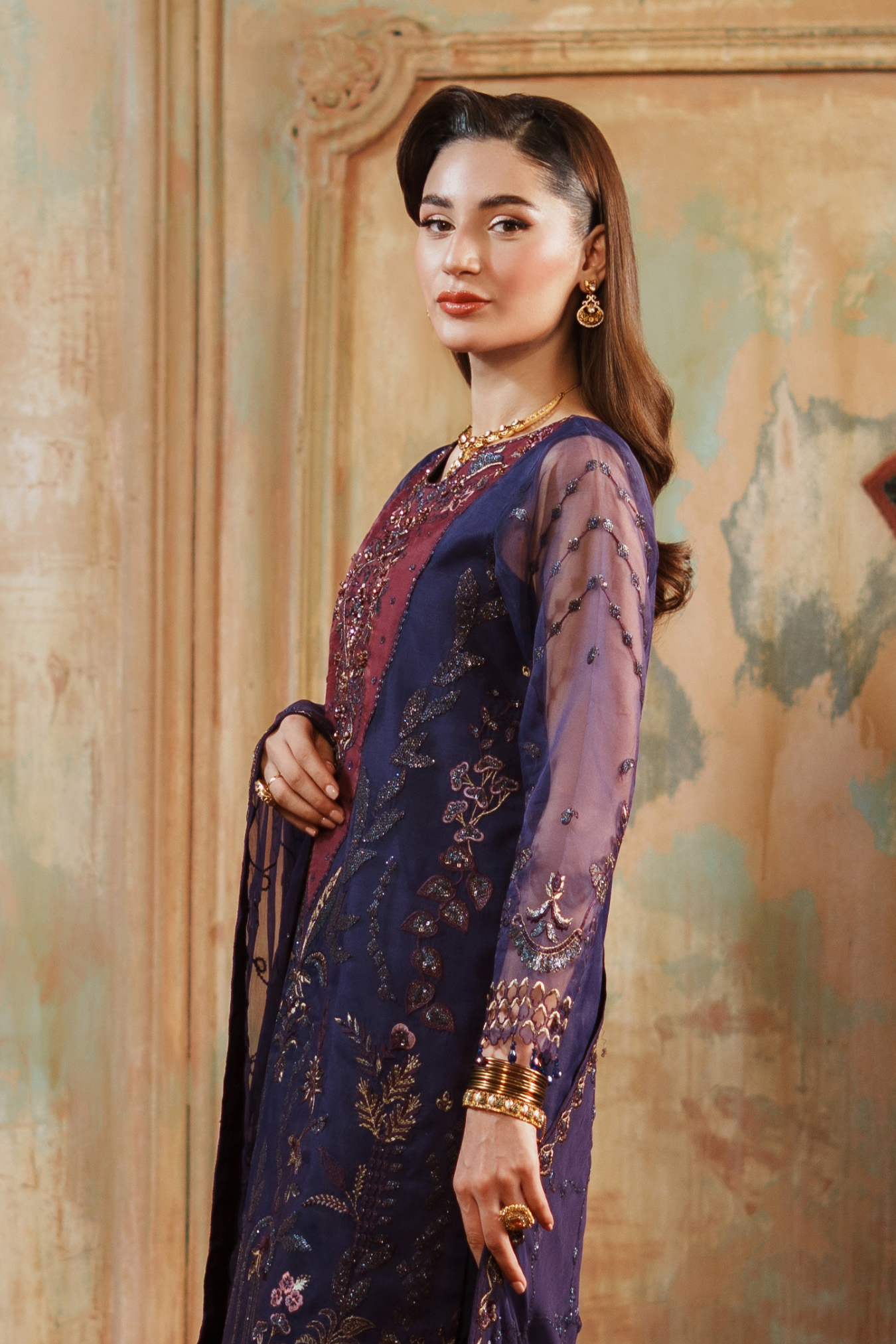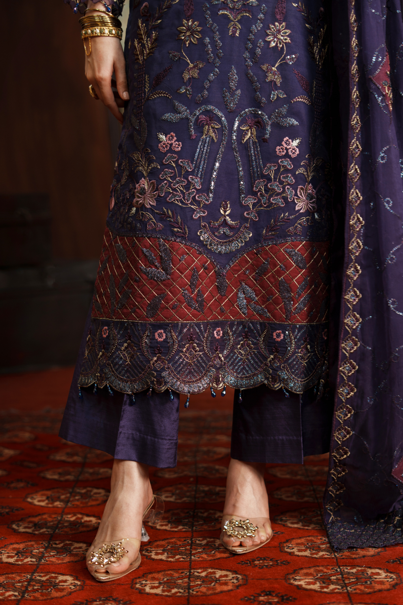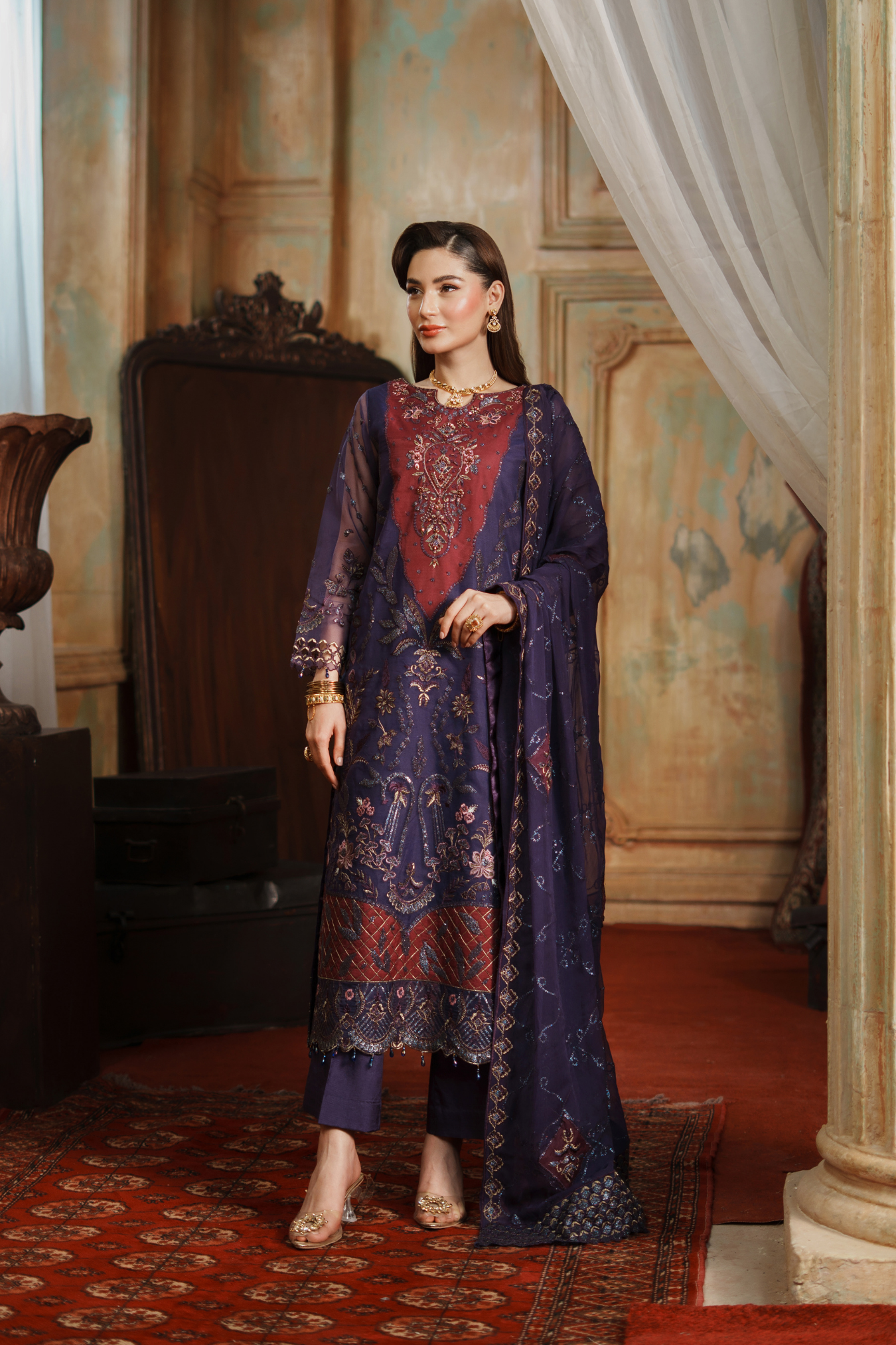 This exquisite ensemble features premium embroidered organza crafted with intricate H.M detailing across the front panel (1 yard), complemented by a matching embroidered back (1 yard) and coordinating sleeves (0.67 yards). The outfit includes decorative embroidered ghera lace borders—32 inches for the front and 64 inches for the hemline—ensuring refined finishing touches. A luxurious weightless chiffon dupatta (2.5 yards) with four-sided embroidered borders provides elegant draping, while the ensemble is completed with comfortable grip silk trousers (2.5 yards) for a polished, sophisticated look.