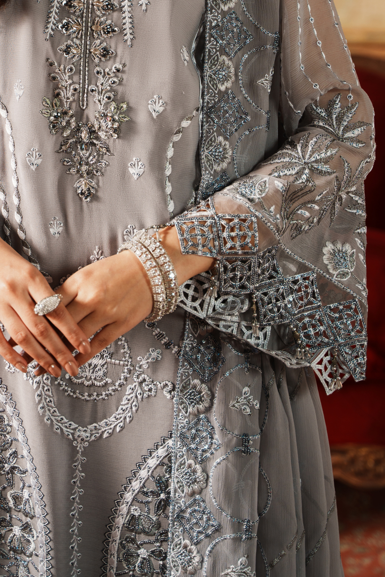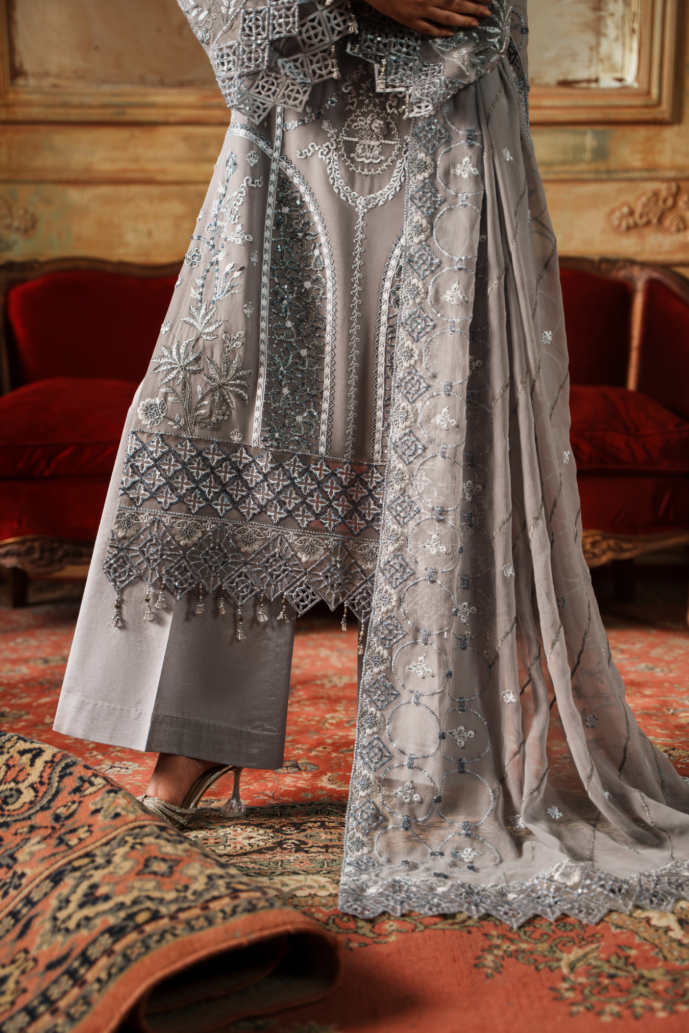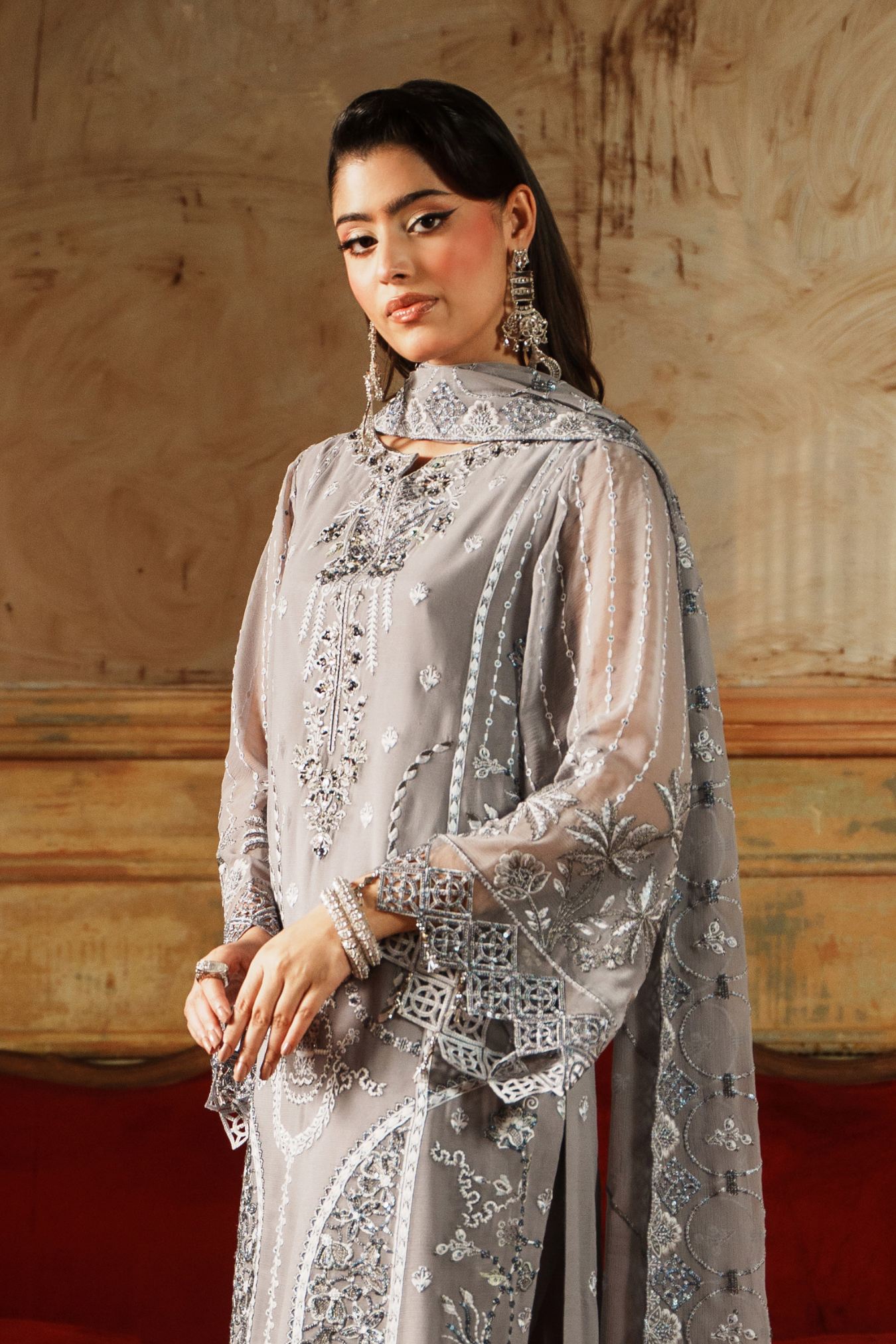 Introducing ZG-06, an exquisitely crafted ensemble featuring premium embroidered weightless chiffon throughout. The front showcases intricate H.M work detailing, while the back and sleeves are adorned with delicate embroidery on airy chiffon fabric. Complementing the design are embroidered ghera laces measuring 64 inches, with coordinating sleeve lace accents. The ensemble includes a beautifully finished four-sided bordered ready dupatta spanning 2.5 yards, paired with comfortable grip silk trousers. Each component is precisely measured for optimal fit and drape, delivering a sophisticated and refined look perfect for special occasions.