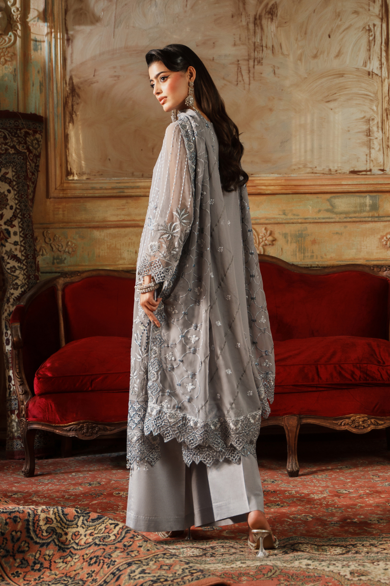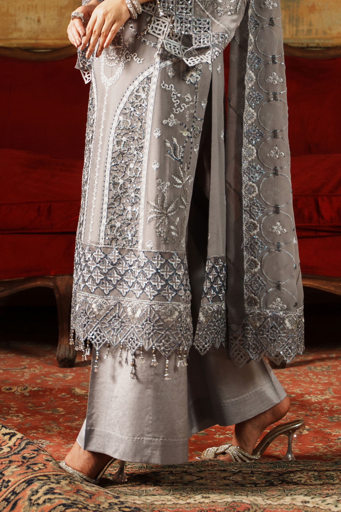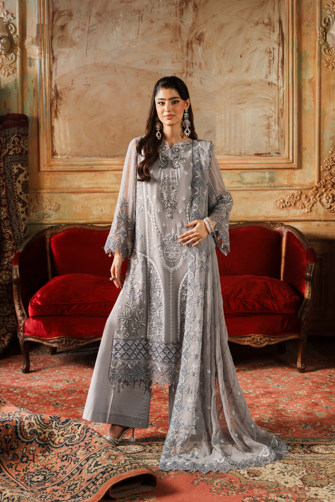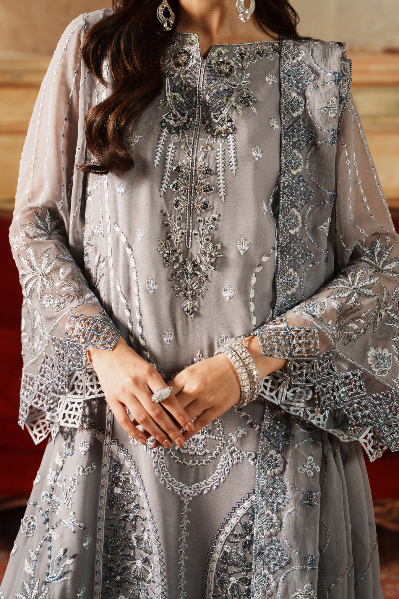 Introducing ZG-06, an exquisitely crafted ensemble featuring premium embroidered weightless chiffon throughout. The front showcases intricate H.M work detailing, while the back and sleeves are adorned with delicate embroidery on airy chiffon fabric. Complementing the design are embroidered ghera laces measuring 64 inches, with coordinating sleeve lace accents. The ensemble includes a beautifully finished four-sided bordered ready dupatta spanning 2.5 yards, paired with comfortable grip silk trousers. Each component is precisely measured for optimal fit and drape, delivering a sophisticated and refined look perfect for special occasions.