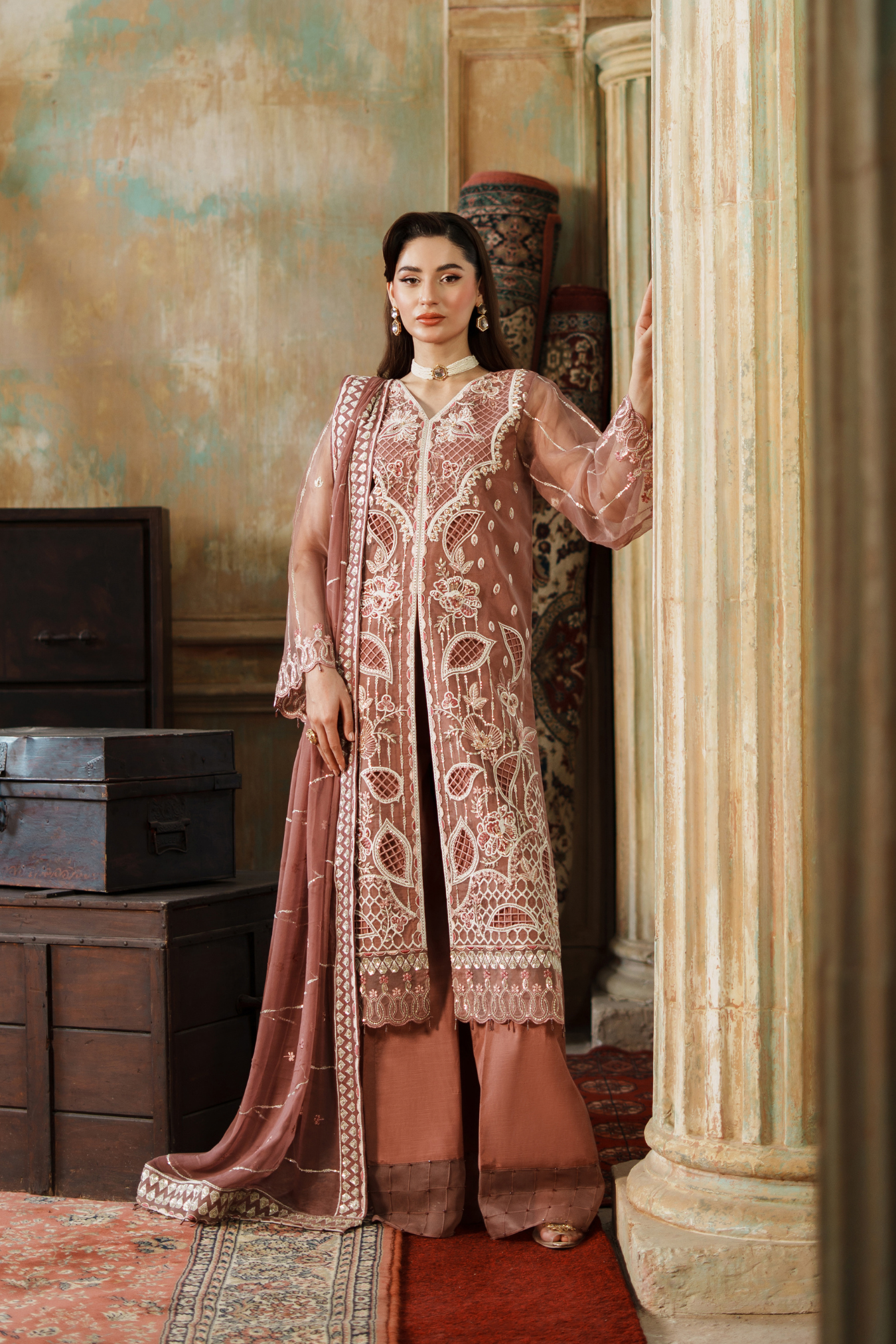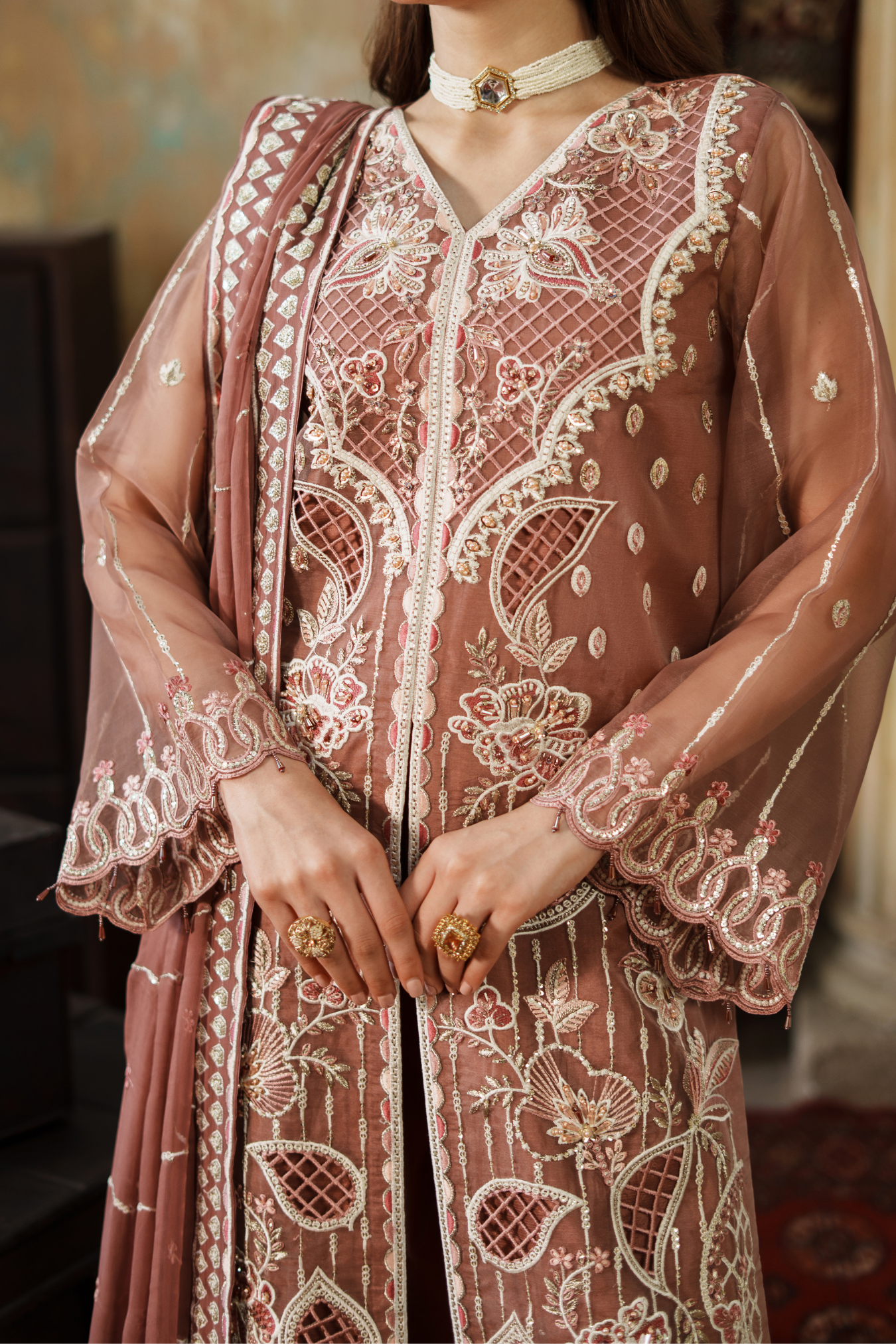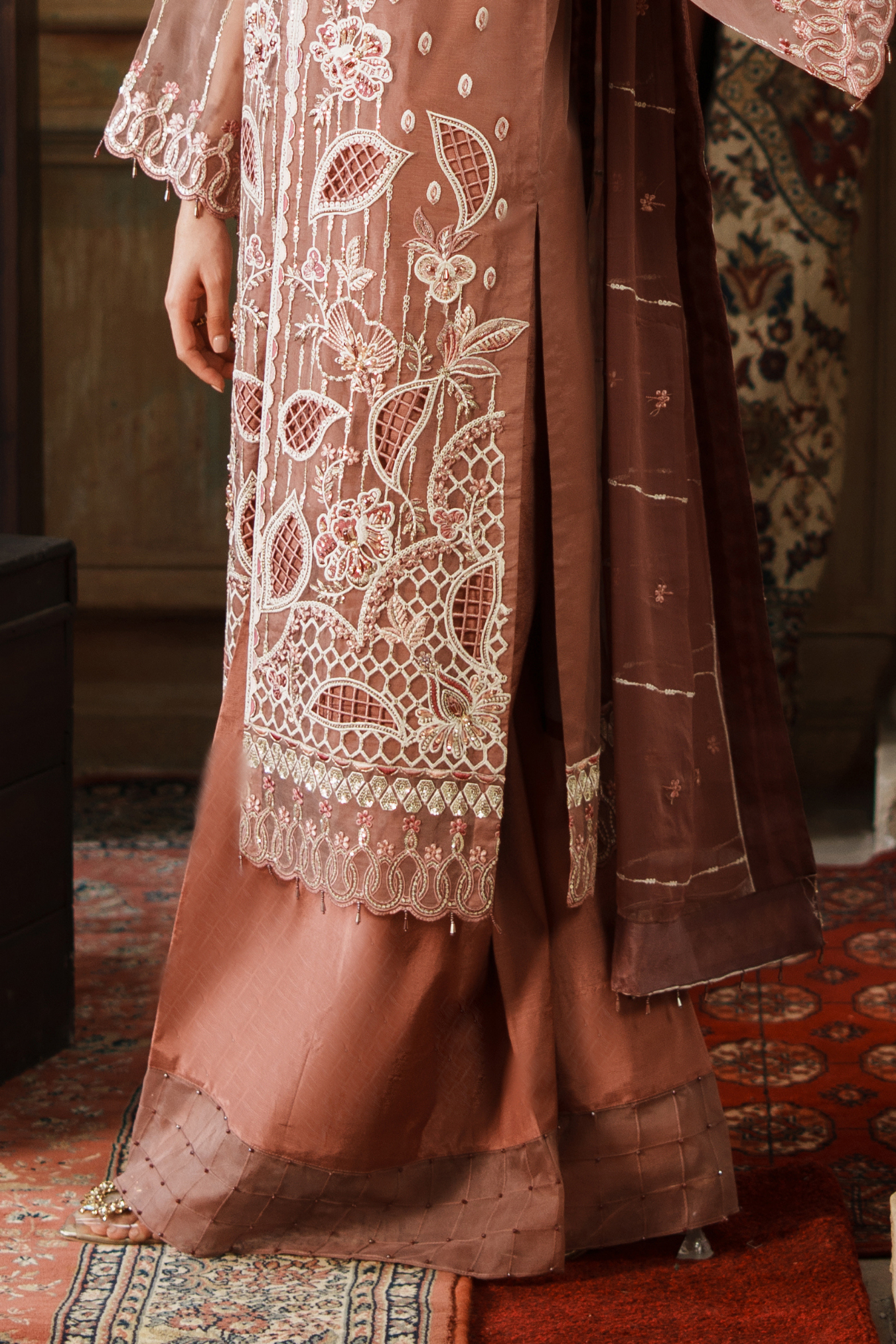 Elegant three-piece ensemble featuring premium embroidered organza components. The front showcases intricate hand-embroidered paneling with detailed H.M work, complemented by a fully embroidered back and sleeves. Includes embroidered organza pieces totaling approximately 3.67 yards, paired with a 64-inch embroidered ghera lace border. Complete with a ready-to-wear embroidered chiffon dupatta featuring four-sided borders and grip silk trousers. Ideal for formal occasions and celebrations.