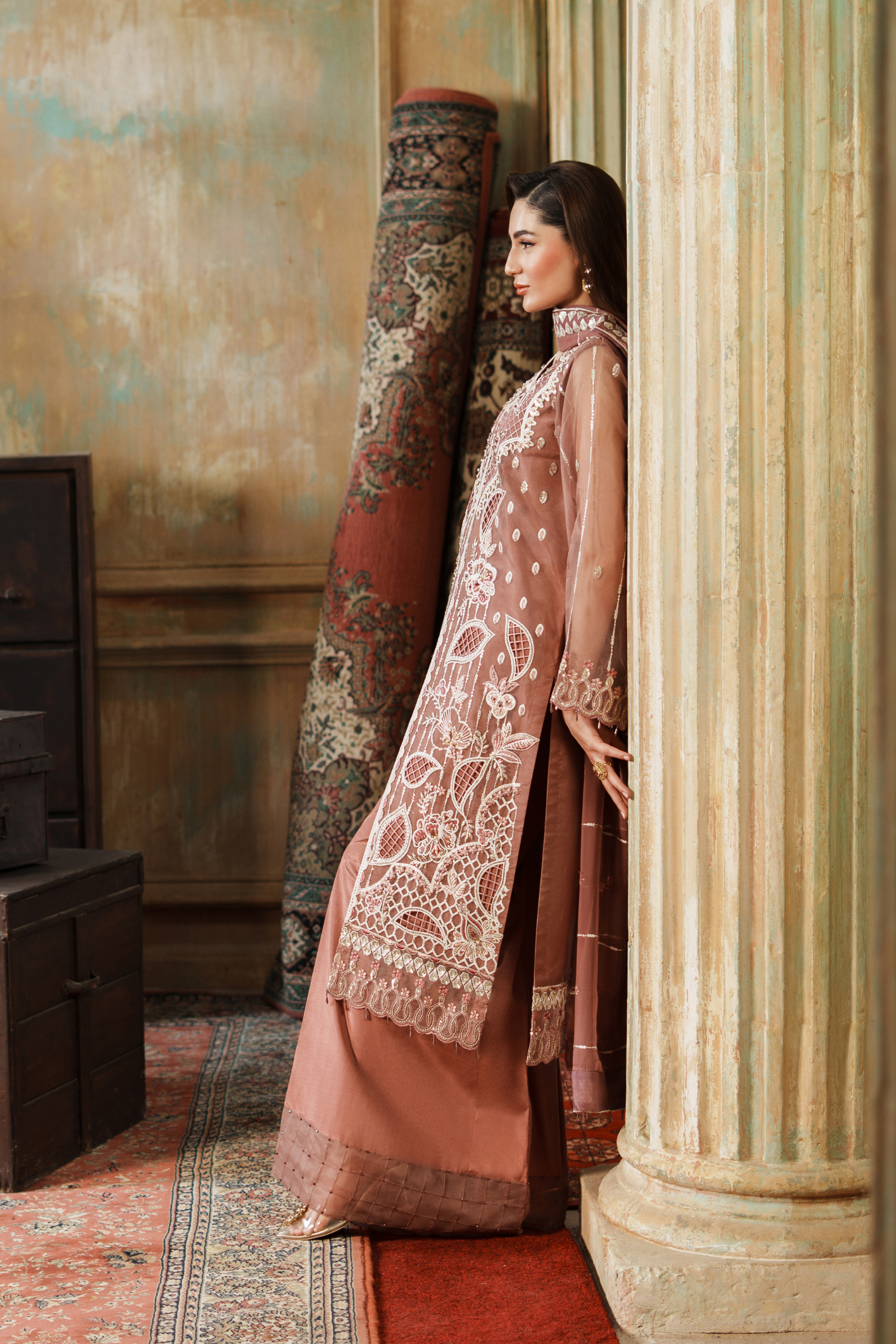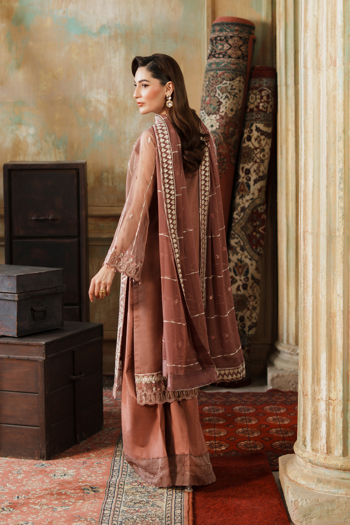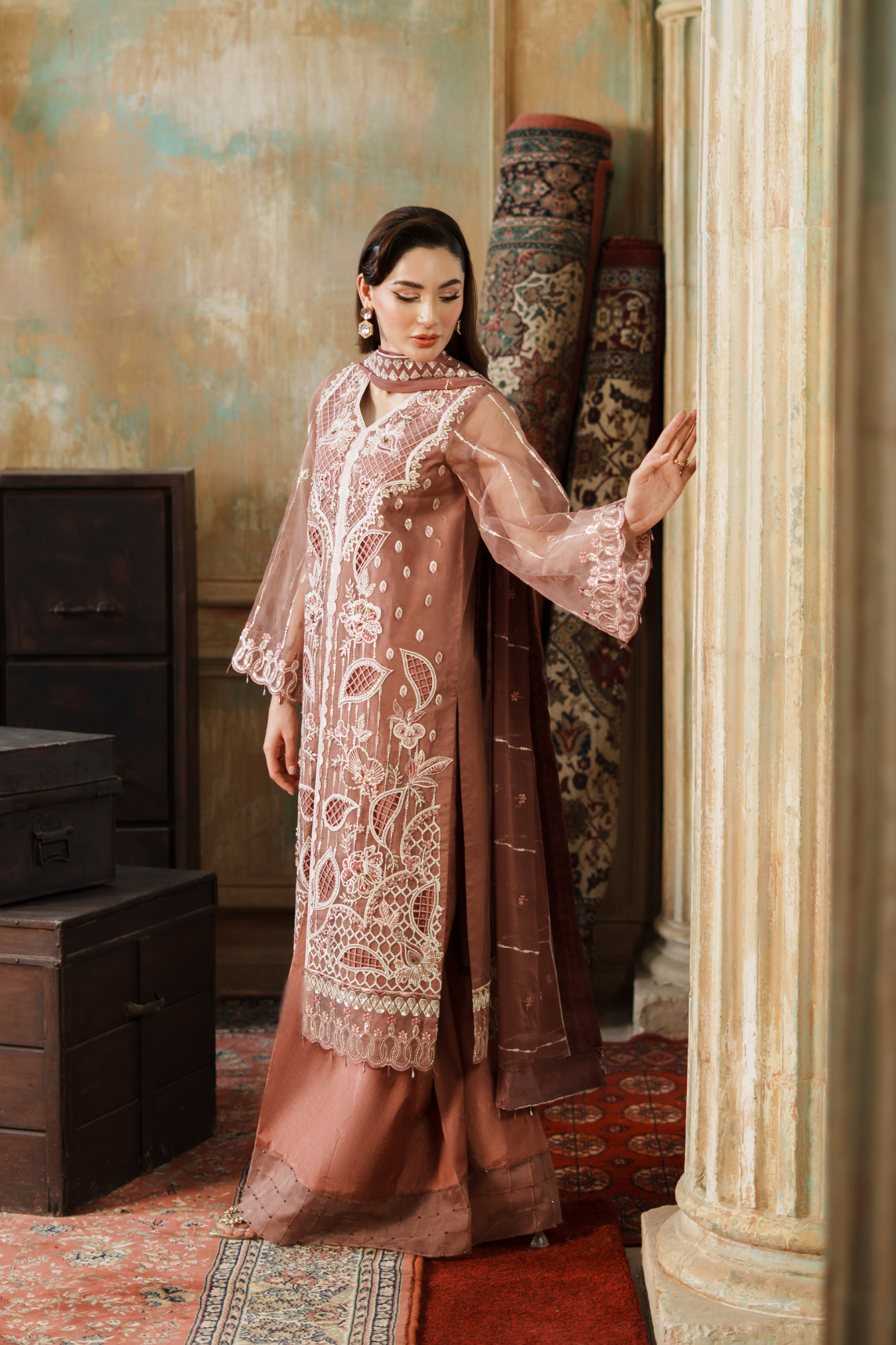 Elegant three-piece ensemble featuring premium embroidered organza components. The front showcases intricate hand-embroidered paneling with detailed H.M work, complemented by a fully embroidered back and sleeves. Includes embroidered organza pieces totaling approximately 3.67 yards, paired with a 64-inch embroidered ghera lace border. Complete with a ready-to-wear embroidered chiffon dupatta featuring four-sided borders and grip silk trousers. Ideal for formal occasions and celebrations.